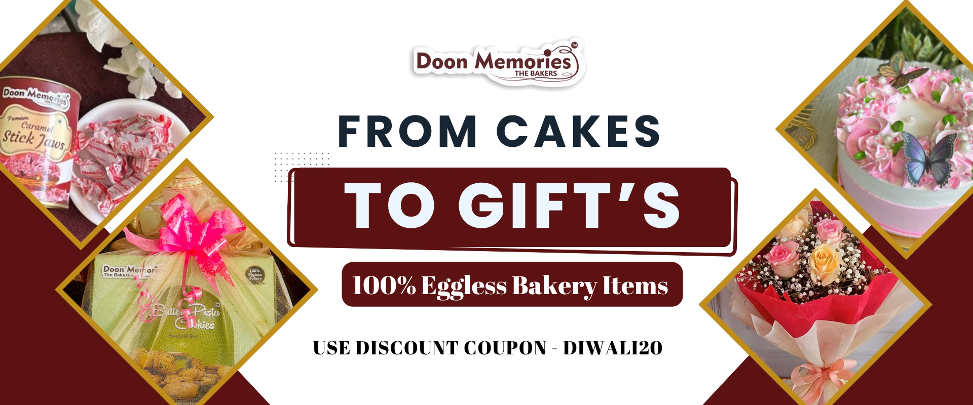 Doon Memories, Dehradun's top bakery, bake 100% eggless cakes, cookies, and milk rusk. Baked with love, Enjoy the taste of tradition and care in every bite, perfect for any occasion. Indulge in our delicious, egg-free creations today!