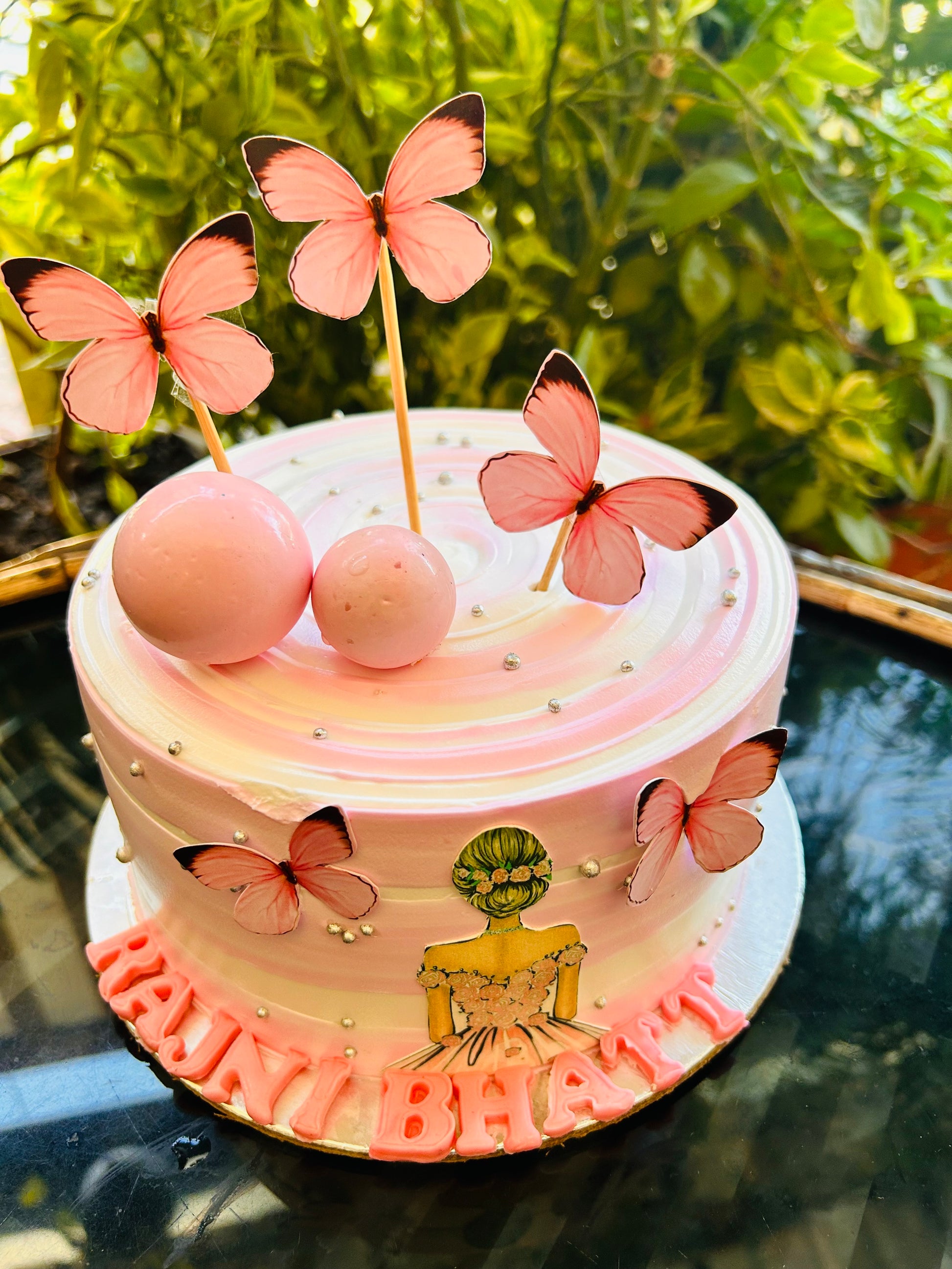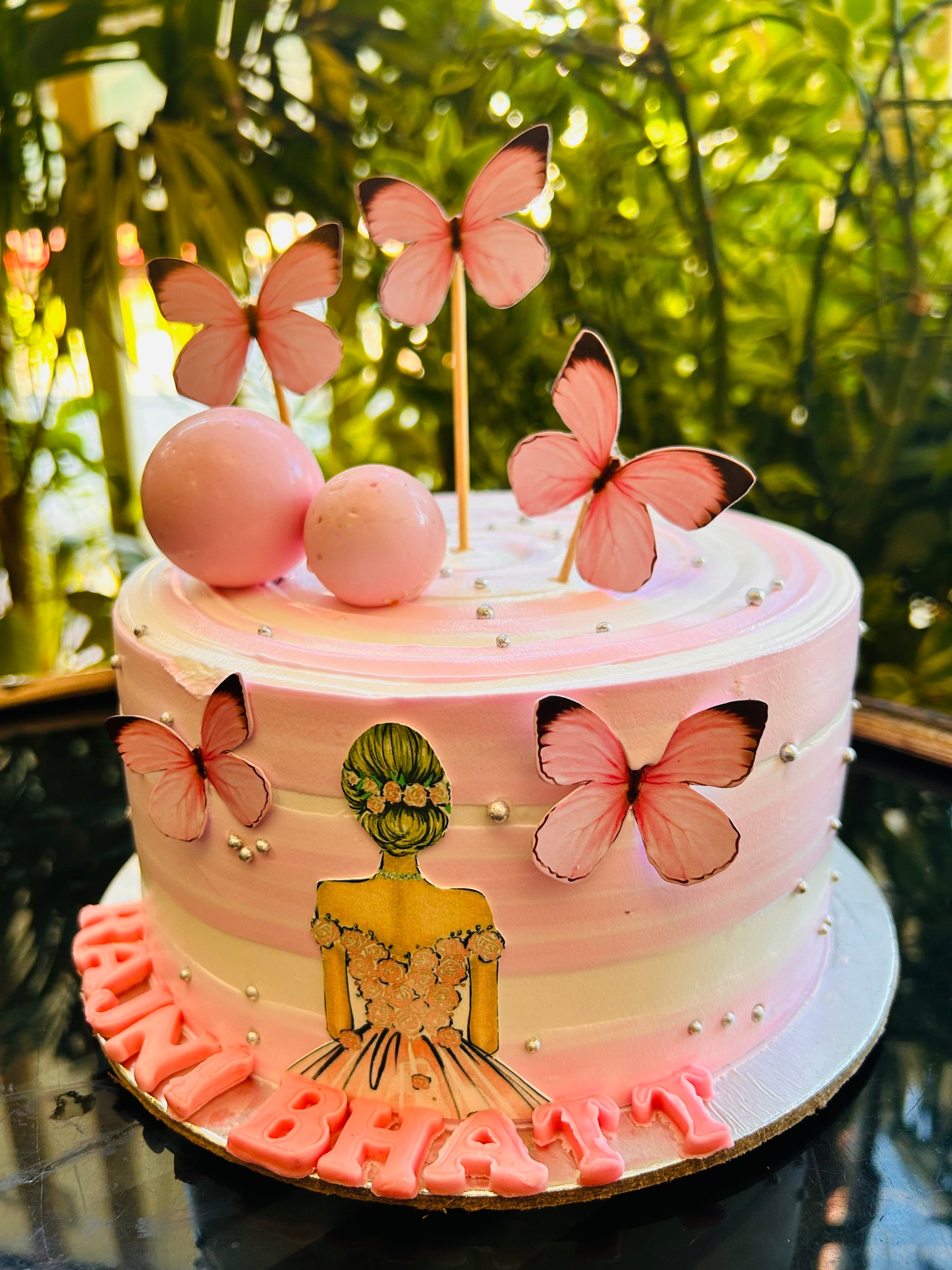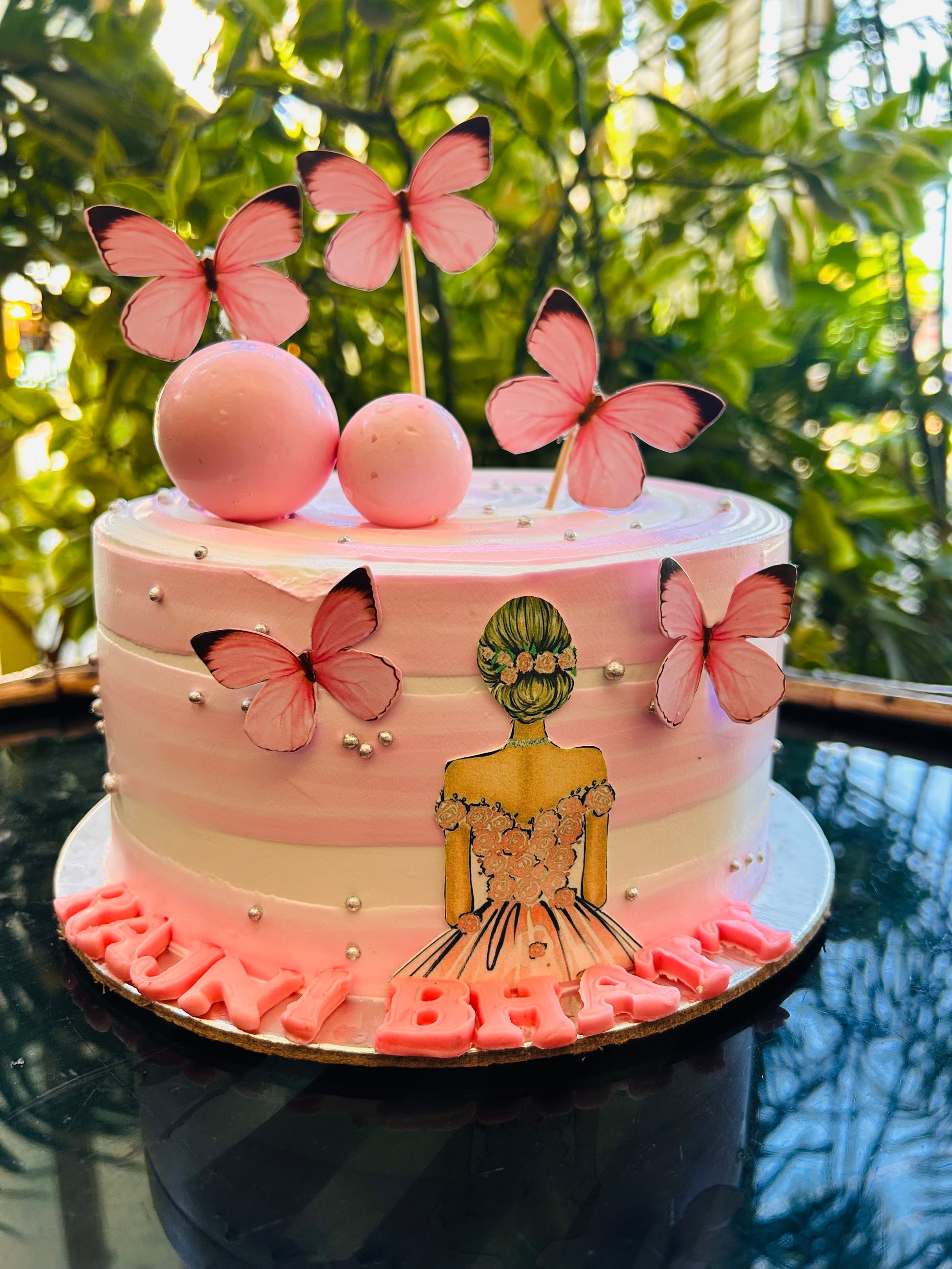 Celebrate in style with our enchanting Butterfly Bliss Princess Cake from Doon Memories Eggless Bakery. Adorned with delicate pink butterflies, edible pearls, and a stunning princess silhouette, this pastel pink and white delight is a dreamy centerpiece for birthdays and special occasions. Customizable with names and flavors, this cake is perfect for someone who deserves a royal treat. Eggless and crafted with love for every magical moment!