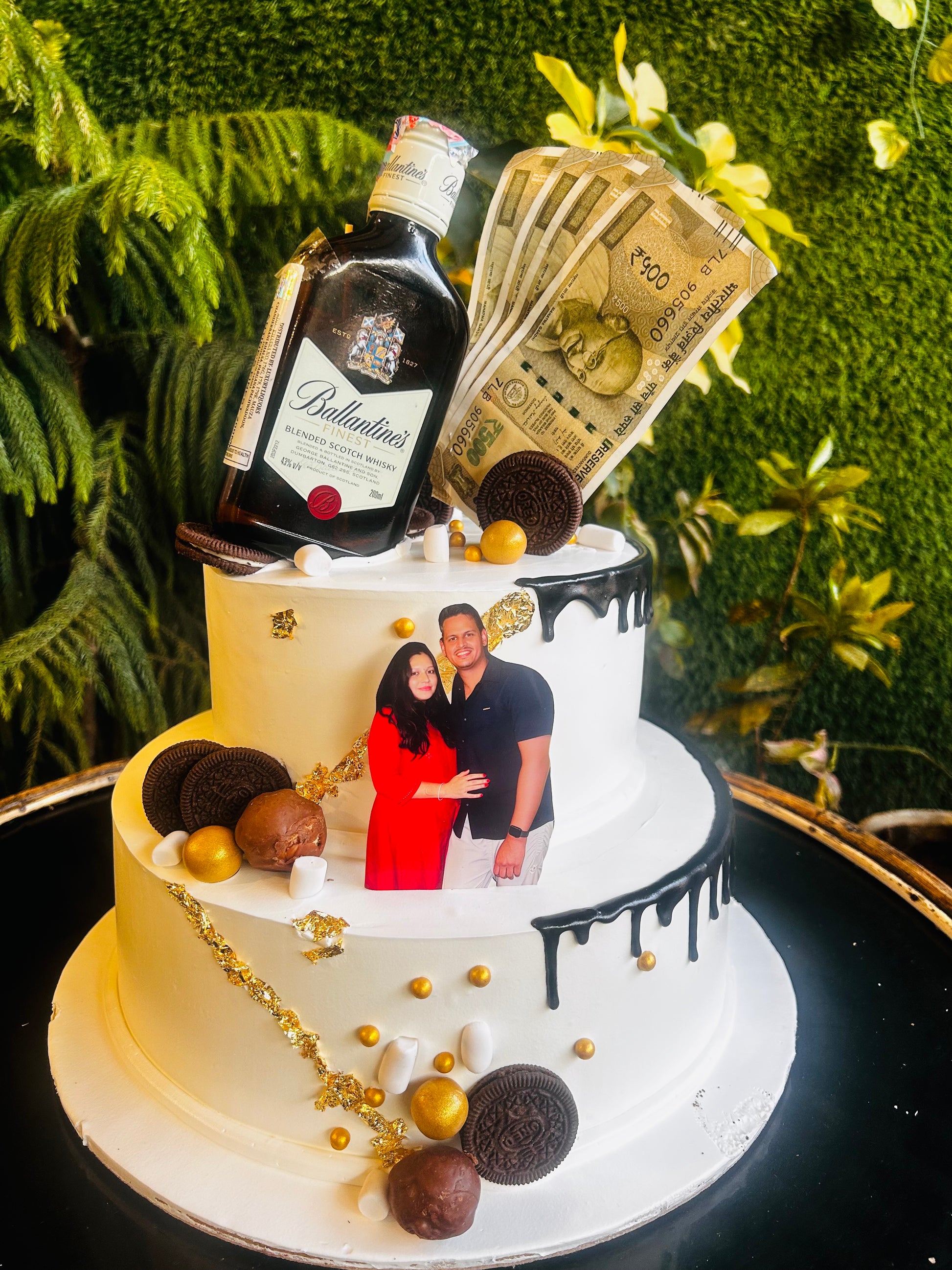 Make every milestone unforgettable with our Royal Cheers Celebration Cake — a luxurious two-tier designer cake crafted for grand celebrations. This elegant cake features smooth white frosting, rich black drip detailing, and premium gold accents that add a royal touch. Topped with indulgent chocolate elements, gourmet cookies, and a bold bottle-style topper, it creates a stunning party vibe.
